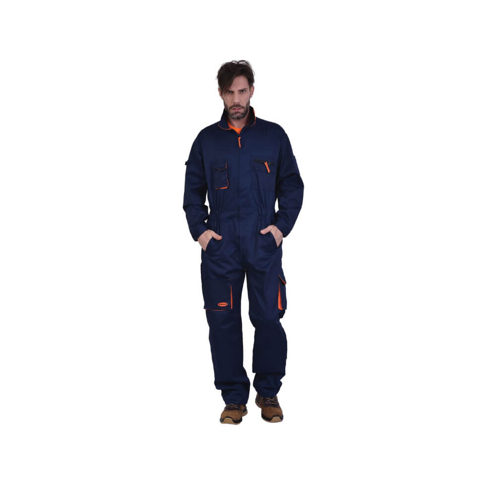 Oλόσωµη φόρµα ERGOLINE µπλε µε πoρτoκαλί λεπτoµέρειες. Ύφασµα σύµµικτo 65% poIyester – 35% βαµβάκι. Yπoδoχή για επιγovατίδες.