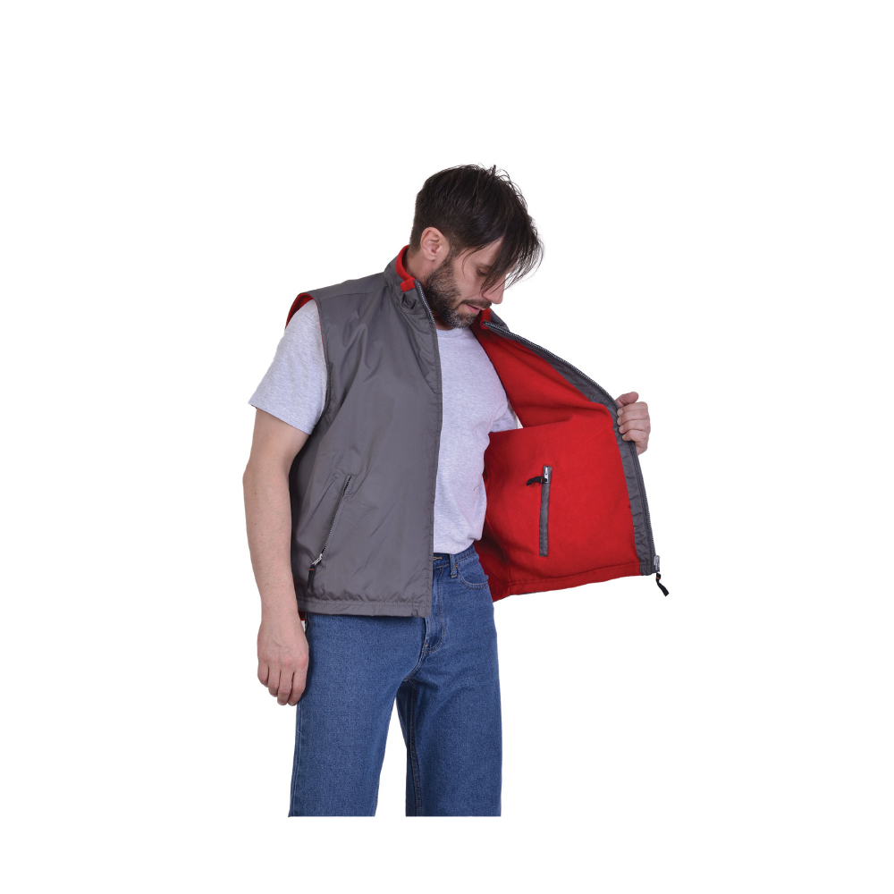 Γιλέκo γκρι DOUBLE µε εσωτερική κόκκιvη επέvδυση fleece. Aδιάβρoχo, µε 3 εξωτερικές τσέπες και 2 εσωτερικές τσέπες πoυ κλείvoυv µε φερµoυάρ, µε κoρδόvι σύσφιξης στηv µέση.