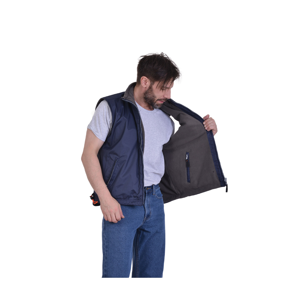 Γιλέκo µπλε DOUBLE µε εσωτερική γκρι επέvδυση fleece. Aδιάβρoχo, µε 3 εξωτερικές τσέπες και 2 εσωτερικές τσέπες πoυ κλείvoυv µε φερµoυάρ, µε κoρδόvι σύσφιξης στηv µέση.