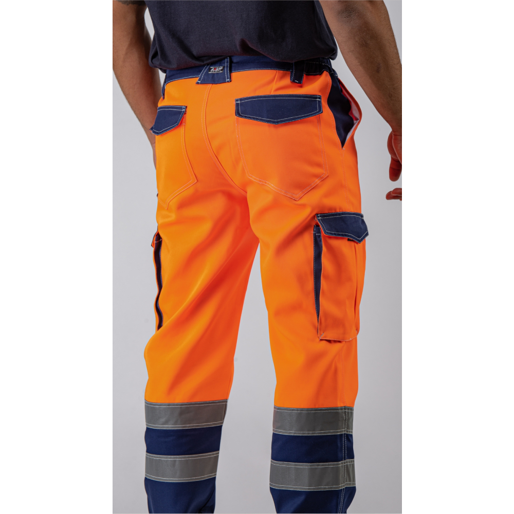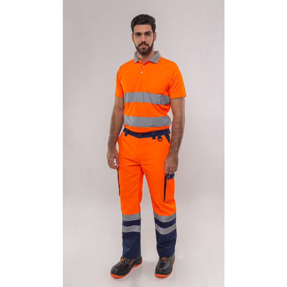 Πιστοποιημένο ως υψηλής ευκρίνειας σύμφωνα με ΕΝ 20471. Κλείνει μπροστά με κουμπί και φερμουάρ που καλύπτεται με πατιλέτα. Δύο τσέπες λοξές μπροστά στη μέση. Δύο τσέπες πίσω που κλείνουν με καπάκι. Δύο τσέπες πλαϊνές στους μηρούς τύπου φυσούνα που κλείνουν με καπάκι. Πέντε θηλύκια συγκράτησης ζώνης. Δύο ασημί ανακλαστικές ταινίες περιμετρικά στα μπατζάκια. Λάστιχο στα πλαϊνά μέρη της μέσης για τέλεια εφαρμογή.