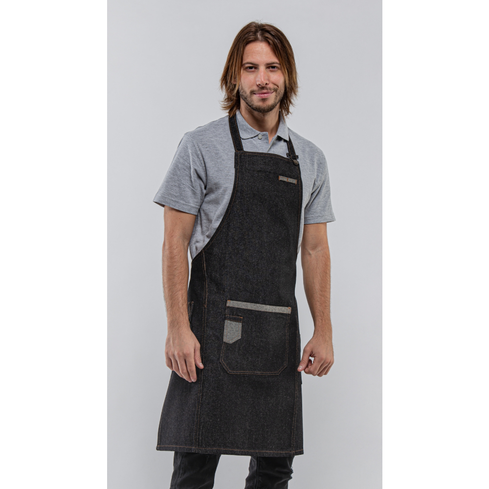 Ποδιά λαιμού Τζιν μαύρη με μεταλλικό μπρονζέ ρυθμιστή για εύκολη χρήση. Μία μεγάλη τσέπη στο κέντρο με επισυναπτόμενη διακοσμητική τσέπη. Μία τσέπη κάτω αριστερά για ανοιχτήρι. Μπρονζέ κρίκος για πετσέτα. Δύο θηλύκια στο στήθος