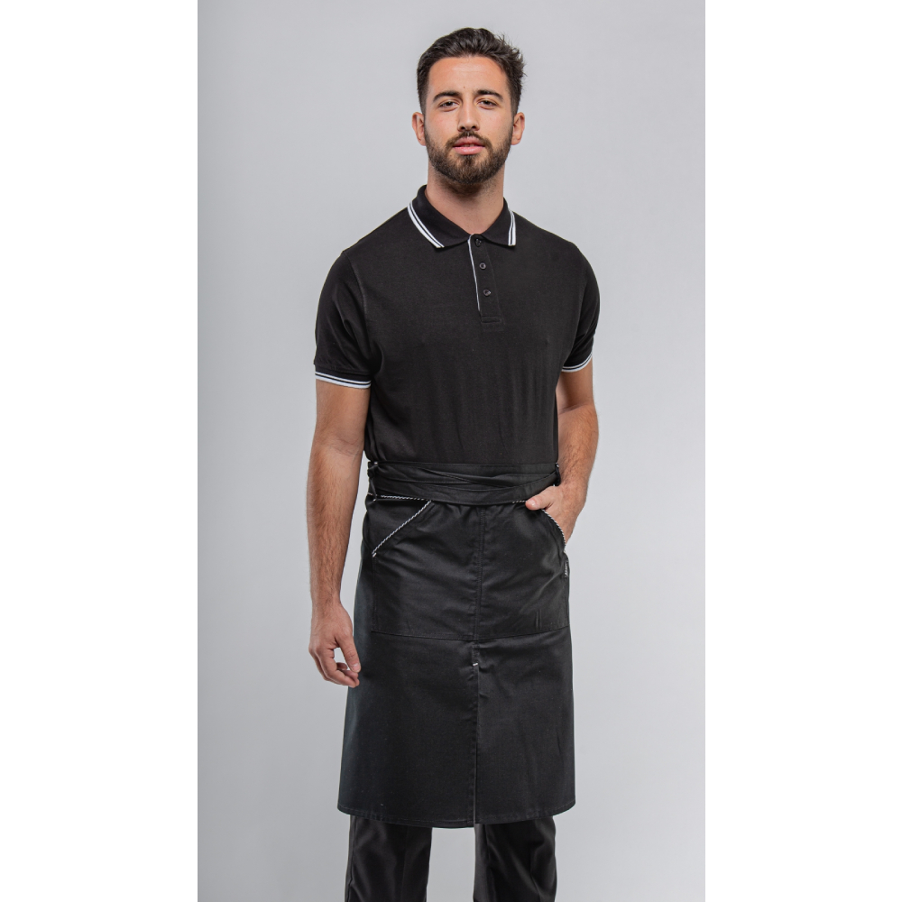 Ποδιά γονάτου με φαρδύ ζωνάρι στη μέση. Μεγάλη κεντρική τσέπη με δύο χωρίσματα. Με σχίσιμο μπροστά. Διακοσμητικό φιτίλι στη μέση και στις τσέπες. Ελληνικό προϊόν.