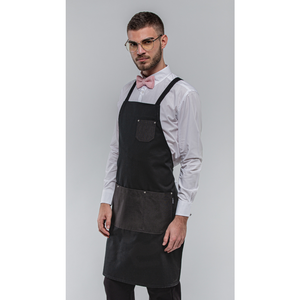 Ποδιά λαιμού με χιαστί λουριά στο λαιμό και μεταλλικό κρίκο στο πίσω μέρος. Τριπλή τσέπη εμπρός και μια μικρή τσέπη επάνω στο στήθος με διακοσμητικά πιρτσίνια. Οι τσέπες είναι απο ύφασμα oxford polyester. Ελληνικό προϊόν.