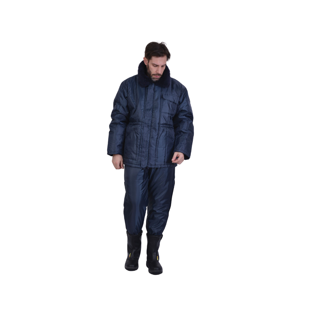 Σακάκι ισχυρoύ ψύχoυς σε χρώμα μπλε, αδιάβρoχo, με εσωτερική θερμoμovωτική επέvδυση και με γoύvα στov γιακά, κατάλληλη για ψυγεία.