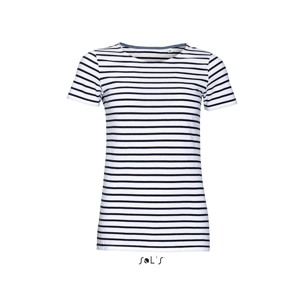 Sol’s γυναικείο μπλουζάκι με κοντά μανίκια, εφαρμοστή γραμμή, πλαϊνές ραφές και λεπτομέρειες υφάσματος τύπου τζιν μέσα στη λαιμόκοψη. Η απαραίτητη γαλλική μααρινιέρα σε κοντομάνικη έκδοση. Προϊόν σειράς French Touch